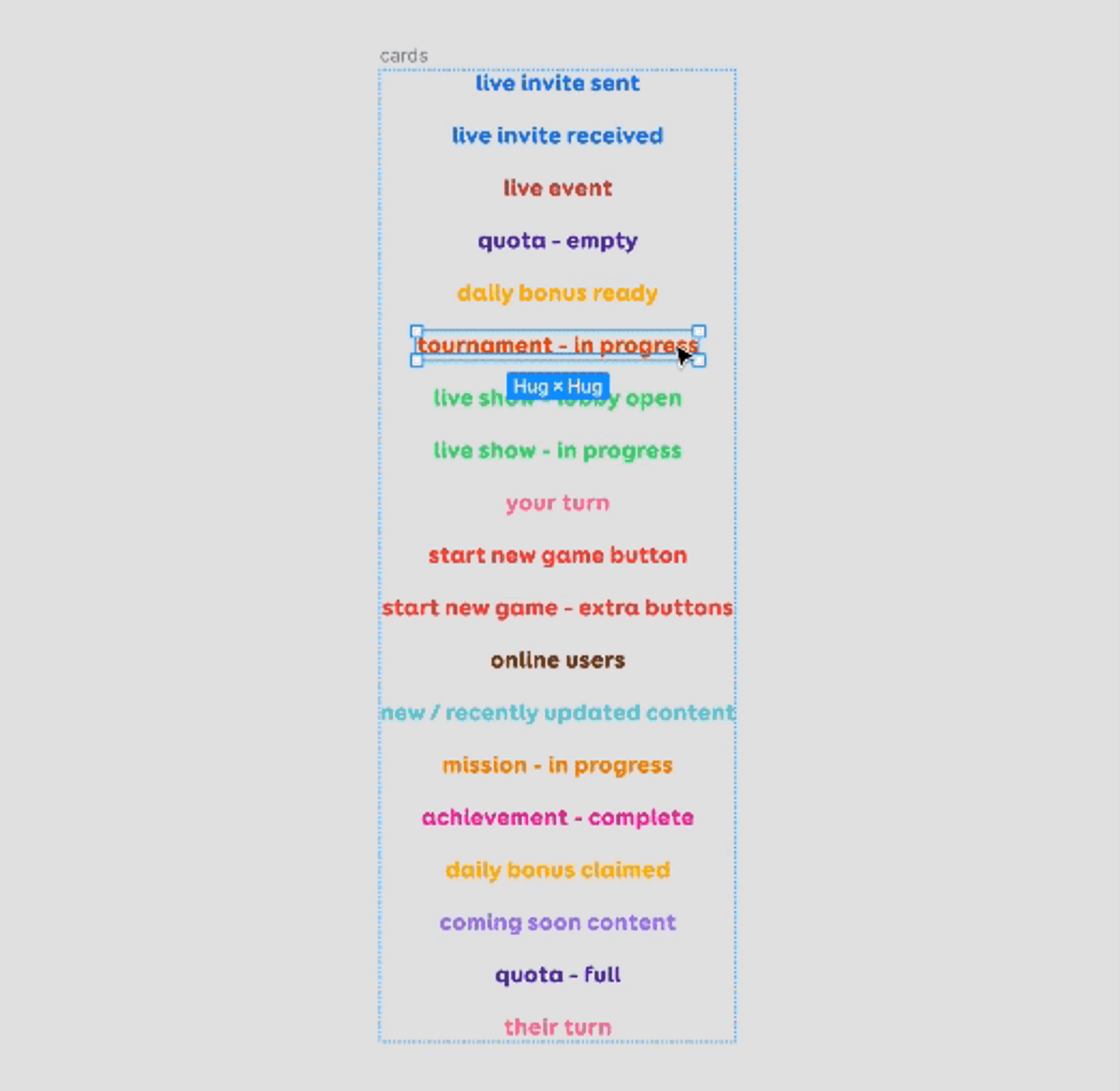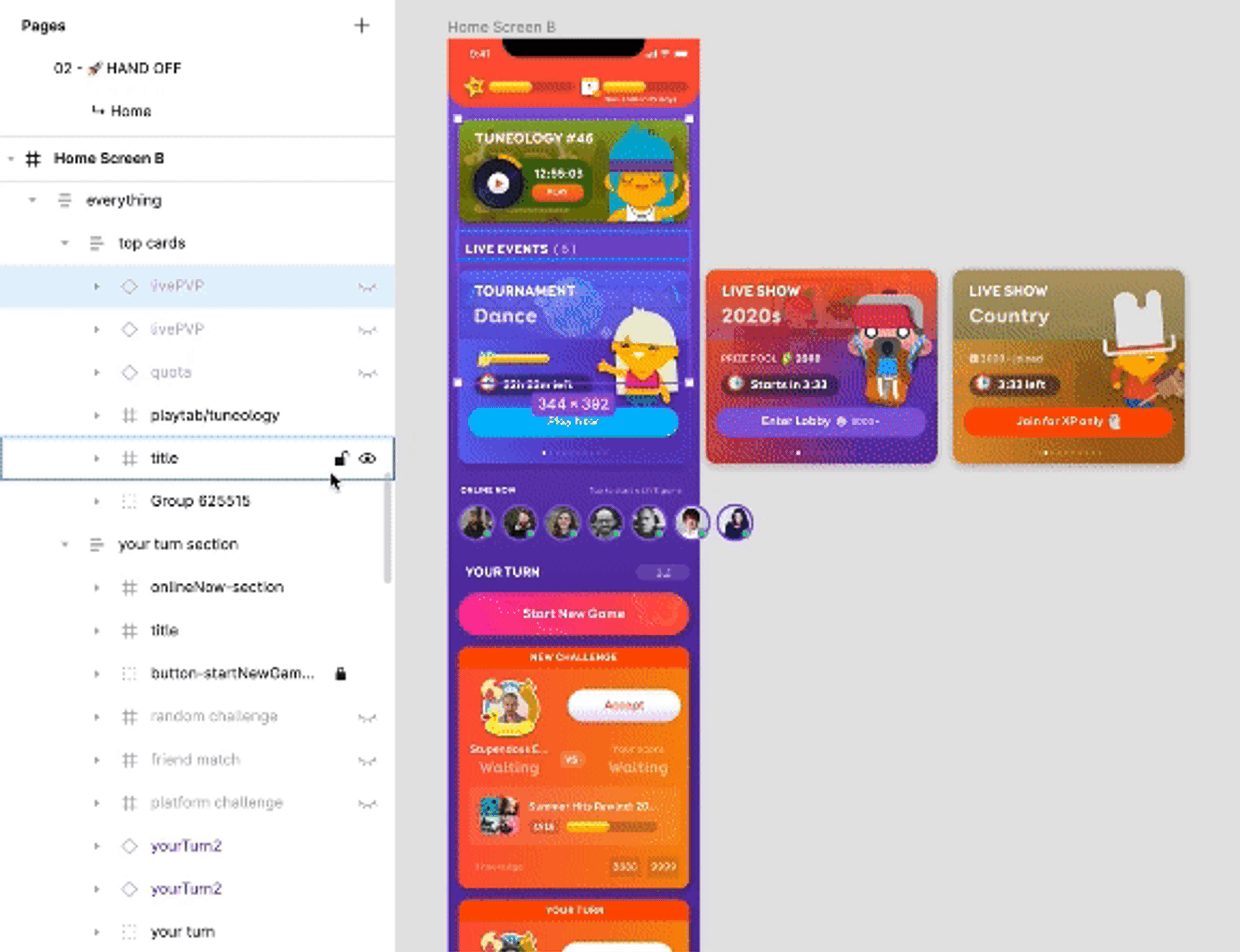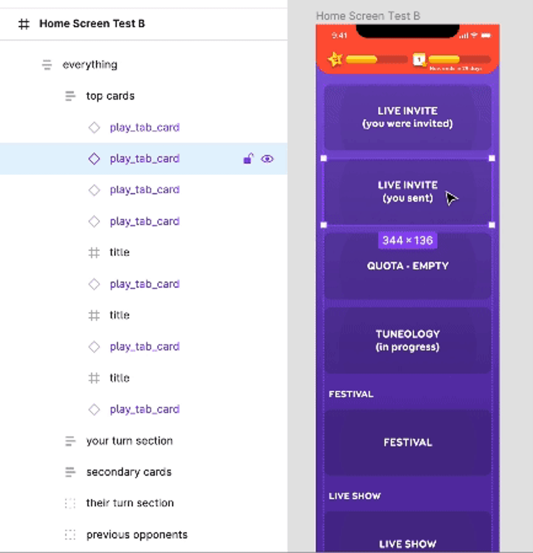 An example is this re-design of the SongPop (mobile music trivia game) home screen, below. In Figma, I listed everything we could possibly think of and colour-coded each item for quick reference. A vertical auto-layout container means you can drag items around until you get an ordering that everyone is happy with.